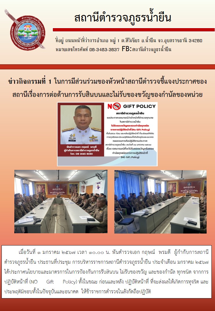 • 023 ประกาศนโยบายต่อต้านการรับสินบน (Anti-Policy) และนโยบายไม่รับของขวัญและของกำนัลทุกชนิด (No Gift Policy) จากการปฏิบัติหน้าที่